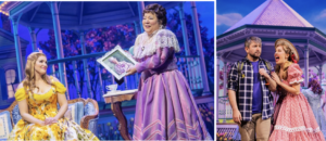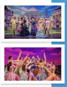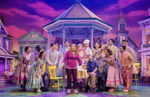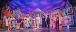 Though new to Broadway, Schmigadoon! was conceived by Saturday Night Live’s Lorne Michaels and is based on Season One of the Apple TV+ original series by the same name. Those familiar with the TV series will enjoy the familiarity of the story. For others, like us, who never say the show, this fanciful journey to Schmigadoon! is captivating. The magic begins when Josh and Melissa step across a simple stone bridge and find themselves in the small town of Schmigadoon, a vibrant, technicolor dreamscape where life is a 1940s/50s musical (reminiscent of Brigadoon, The Music Man, and Oklahoma!). In Schmigadoon, the weather is perpetually sunny, and everything is meticulously maintained, with brightly colored houses. The townsfolk wear pristine period costumes (puffy dresses, waistcoats, and hats) and are always smiling and joyful.