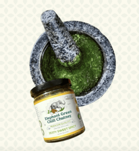 Elephant Green Chili Chutney is a versatile sauce that can be dipped, drizzled, or used for simmering or sautéing. Tanzie suggests that chutney pairs well with cheese and recommends combining chutney with whipped cream cheese as a spread for a bagel. Consider adding chutney as a side to a vegetable and cheese platter.